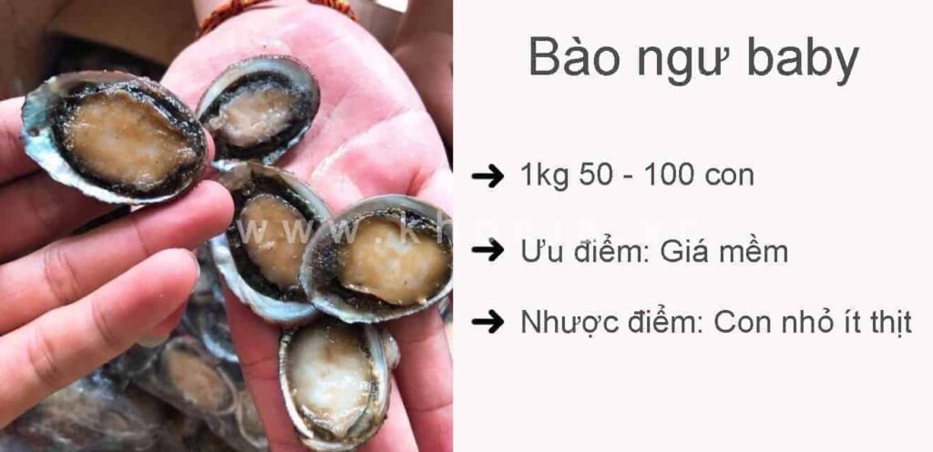 Bào ngư baby là loại bào ngư size nhỏ. 1kg bào ngư baby từ 50 – 100 con/kg. Bào ngư baby ưu điểm là giá sẽ mềm hơn loại bào ngư to nên người tiêu dùng dễ mua.
