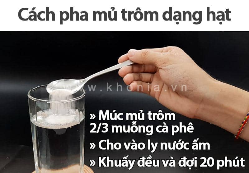 - Cách ngâm mủ trôm là lấy 2/3 ly nước ấm, dùng muỗng nhỏ mình tặng kèm lấy 1 muỗng mủ trôm rắc vào ly. Sau đó khuấy đều để 15 – 20 phút cho mủ trôm nở hoàn toàn.