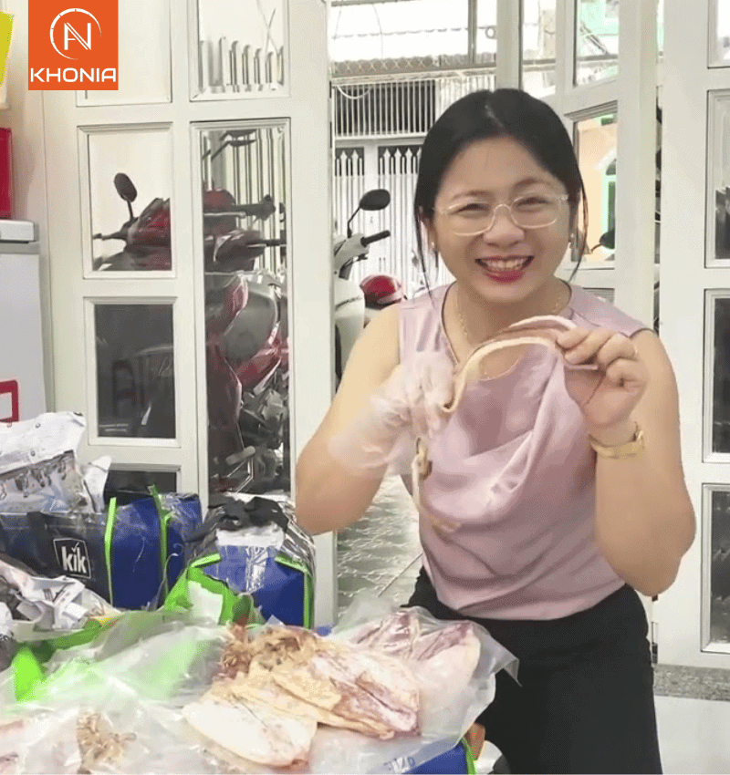 Khô mực câu và tôm thẻ thiên nhiên là 2 món mà anh chị rất thích để thêm vào giỏ quà. Giỏ quà từ 1 tới 2 kg anh chị có thể mang đi xa, đi biếu ngoài tỉnh vẫn được nhé.