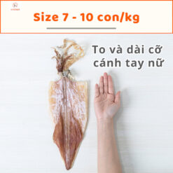 Khô mực size 7-10 con/kg: nhìn hình là anh chị thấy con mực to và dài thế nào rồi. Chỉ tính riêng thân mực cũng dài bằng cánh tay nữ.