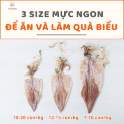 3 size mực được anh chị chọn nhiều nhất là: size lớn 7 – 10 con/kg, size trung 12 – 15 con/kg, size vừa 18 – 20 con/kg.